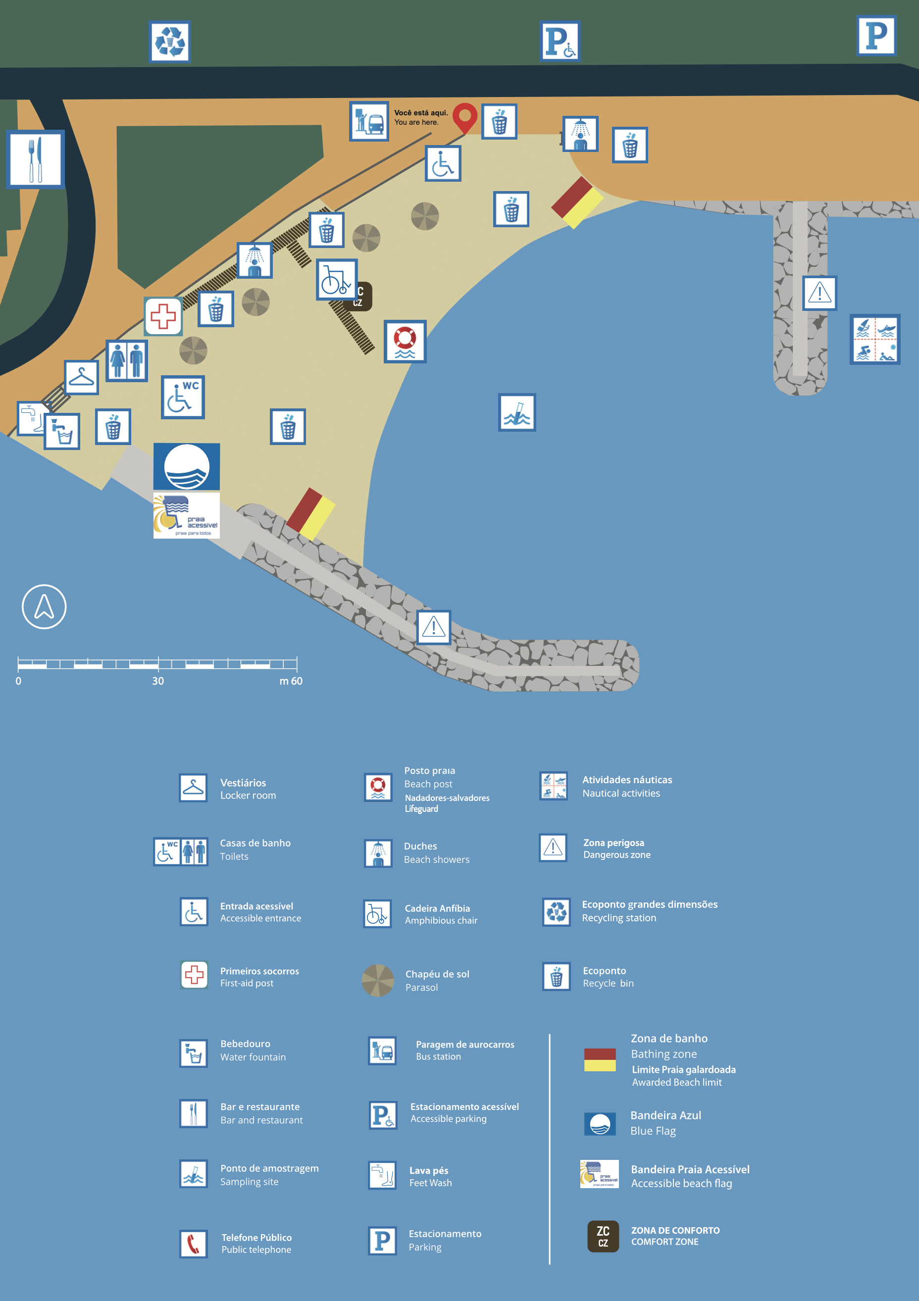 As condições de cumprimento obrigatório que determinam a atribuição da classificação de “Acessível” a uma zona balnear e que permite o hastear do respetivo galardão dividem-se em duas grandes vertentes: